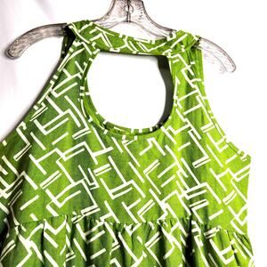 Embrace the timeless charm of the 90s with this versatile and stylish Lemmie for Nina Leonard Lime Green Linen Blend Dress. The retro pattern and keyhole open back add unique touches, perfect for both casual and evening wear. In new, unworn condition, this dress is ready to enhance your wardrobe.