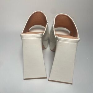 Step into bold confidence with these Lemon Drop white platform mules. Featuring a sleek open-toe design, wide strap, and sculpted block heel, they offer a perfect mix of retro glam and modern edge. Ideal for nights out or elevating any chic daytime look with a statement finish.