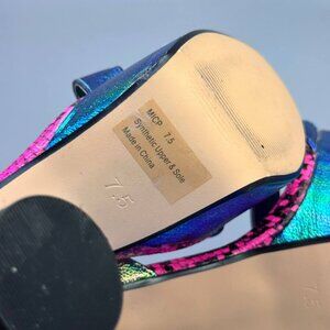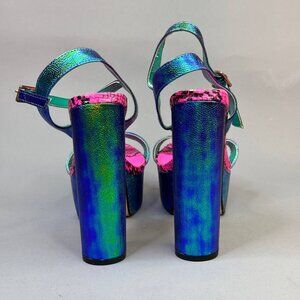 Turn heads with these bold and colorful platform heels from Lemon Drop by Privileged! Featuring a stunning iridescent green-blue finish, bright pink snake print insole, and towering block heels — these shoes are made for fearless fashionistas.
