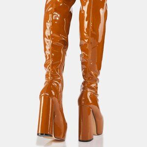 Lemon Drop by Privileged To The Sky Thigh High Platform Boots you're on the stairway to heaven! These thigh high boots have a patent design, side zipper closures, platform soles, and block heels ( COGNAC )