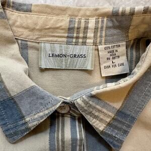 Lemon Grass Beige Blue Plaid 100% Cotton Shirt Size L Retro Grunge Western