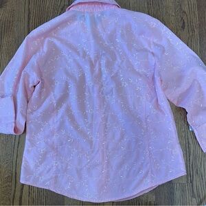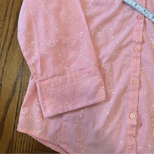 This is a ladies Lemon Grass Studio button down, it is a peach color with white floral detailing. The sleeves are 3/4 in length, shirt is 80%polyester and 20% cotton, size small.