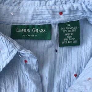 Light blue, crinkle cotton blend.blouse for many occasions. Embroidered are polka dots, red, blue and white. Rounded at the bottom. 3/4 sleeves with cuff (can be worn folded up or lowered down). There are darts on the front and back to make the blouse fit nicely.