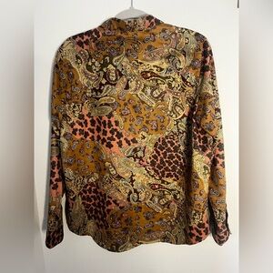 Stylish button-up shirt with a paisley and leopard print design. Features a mix of brown, pink, and gold colors.