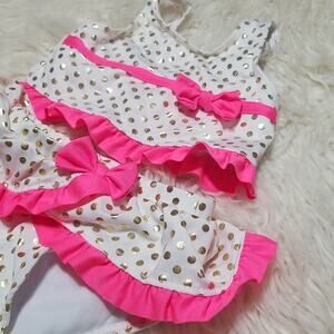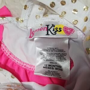 Lemon Kiss Baby Girls White, Gold and Pink Polka Dot Bikini Swimsuit in excellent condition.