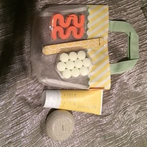 Foot gel, Fizzies, Pumice Stone, Emery Board, Top Separators and gift bag.