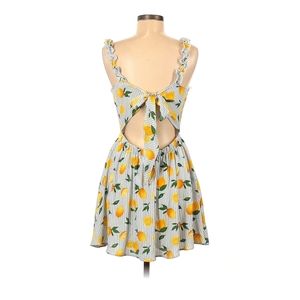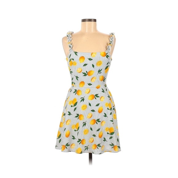 Brighten your wardrobe with this delightful lemon print mini dress. The playful ruffle straps and vibrant yellow accents make it a perfect choice for sunny outings.