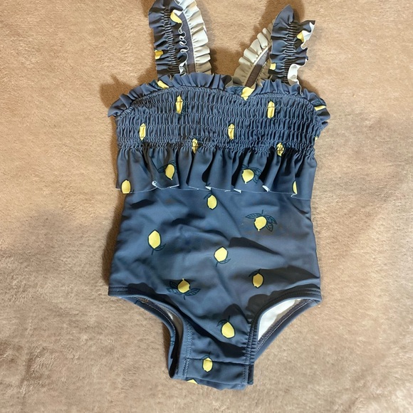 Adorable dark gray swimsuit with lemon print. Features ruffled straps and smocked bodice. Button up bottom for easy wear!