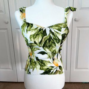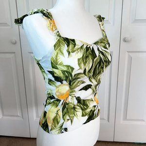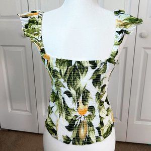 Ruffled tank top with smocked back with printed lemons/lemon tree, size small. Perfect for a summertime day with friends!