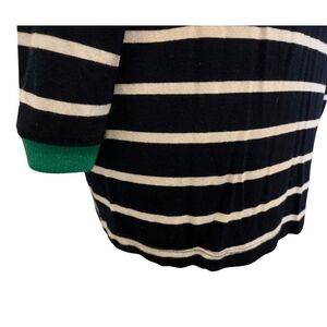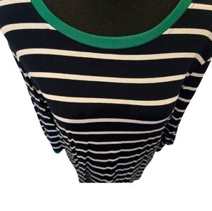 Long sleeve striped Navy and white shirt with a pop of kelly green color on the trim of collar and sleeves.