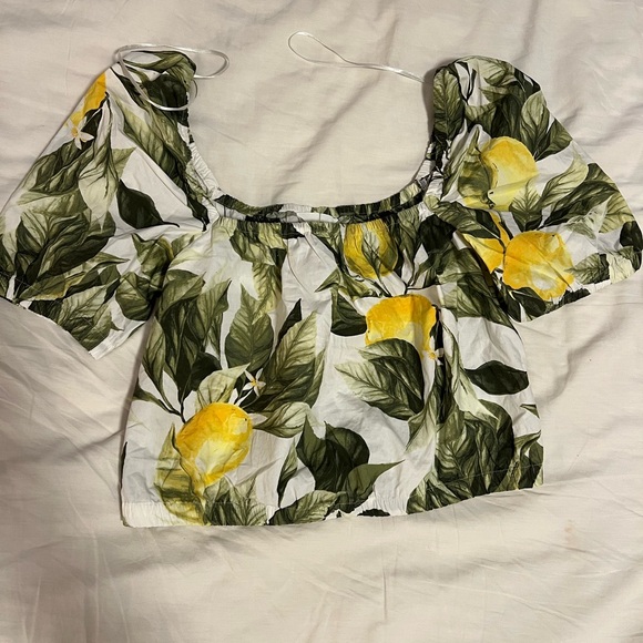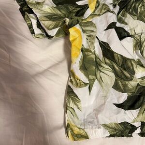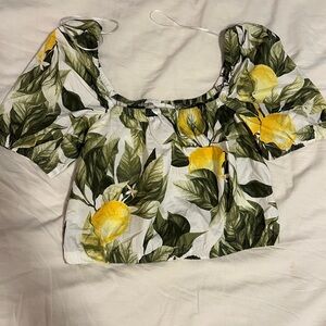 Embrace a fresh look with this stylish floral lemon print top. Perfect for adding a pop of color to your wardrobe.