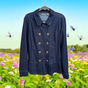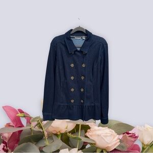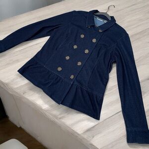 Elevate your style with this elegant navy double-breasted jacket. Perfect for any occasion, it offers a sophisticated look with its classic design. Lemon Way Wonder Stretch Knit Denim Peplum Jacket size L excellent condition