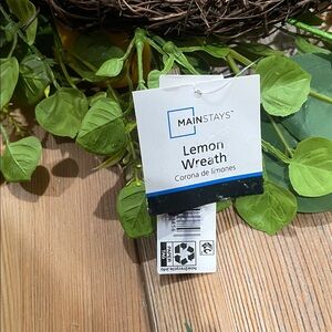Brand new! Never used! Artificial greenery and lemons attached to grapevine wreath form. Approximately 16 inches across.