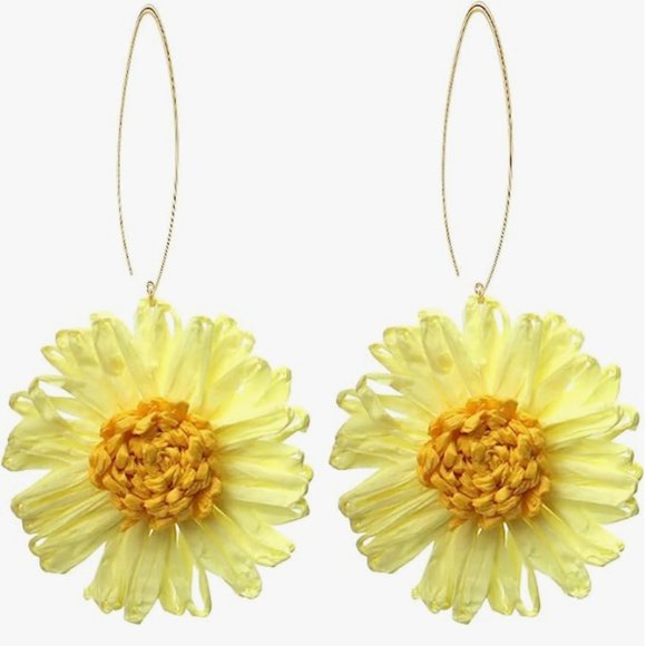 Lemon Yellow Raffia Flowers Wire Statement Earrings Big Wicker Vacay Flowers New