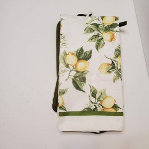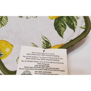 Brand new 5-piece kitchen linens set in a Mediterranean Lemon theme design. Set includes 2 towels, 2 pot holders, 1 oven mitt. Pretty design of lemons and citrus branches and blossoms in yellow and green on a white background. Trimmed and backed in green. The set includes two printed towels, one large oven mitt and two pot holders (5 pieces altogether).