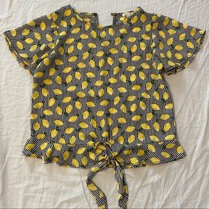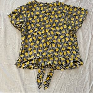 Black and white striped blouse with lemon pattern. Ruffle at bottom. Tie detail in front. Lightly worn. Size XS.