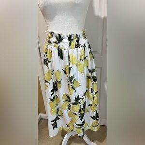 Lemon print skirt - medium. Tag says large but I think it measures more like a medium. No other tags in skirt. 26 inch elastic waist and the skirt is 30 inches long. Light fabric - maybe a poly blend. Smoke-free home.