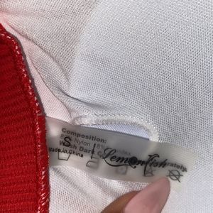 Beautiful and sexy red bikini from Lemon Fish. Features a bandeau top design and vertical line print all over the red bikini. Perfect for the beach or for the pool!