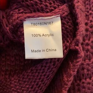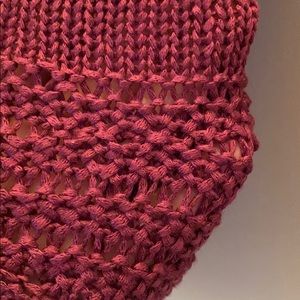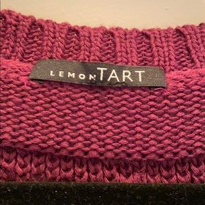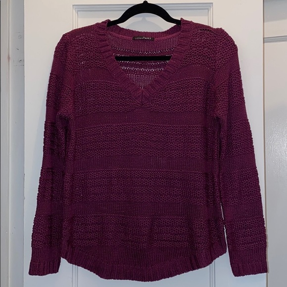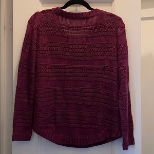 Purple knit sweater, size medium. There is a longer loop on the inside of the sweater but on the outside it looks fine. In good condition.