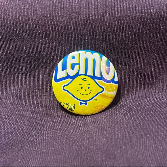 Handmade 1.25in button pin featuring classic candy packaging from Lemonhead.