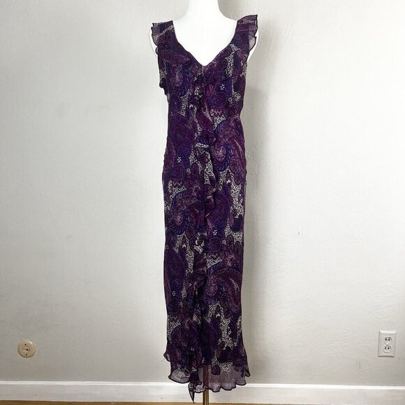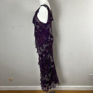 Lena Medoyeff Maxi Dress 100% Silk Purple Paisley V-Neck Ruffle Layered Size 6