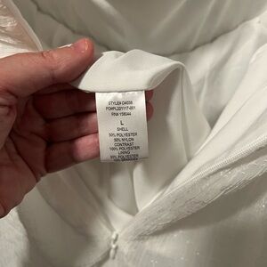 New without tags - The Lena White Bustier Strapless Cocktail Dress is fully lined featuring a sheared strapless top with non slip grip padding. The top skirt has some subtle sparkle to it and there is mesh beneath to make for a full and dramatic skirt. The cups on the top are not large, The shell of the dress is 50% nylon and 50% polyester, the contrast is 100% polyester. and the lining is 90% polyester 10% spandex.