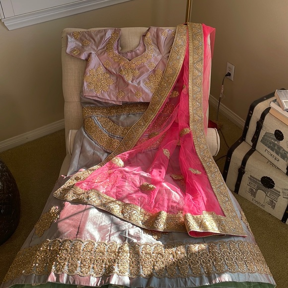 Beautiful iridescent two tone blue satin silk lengha. Never worn. Intriguing and unique apron detail and gorgeous full volume petticoat underneath. A few tiny imperfections/ stains (photos provided), hardly noticeable. A sure stunner at your next wedding or Indian event!