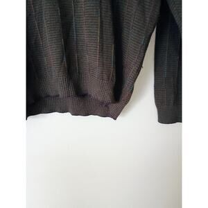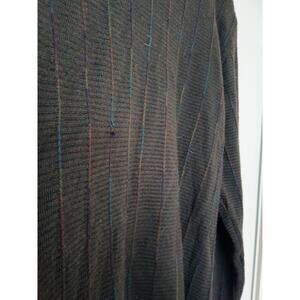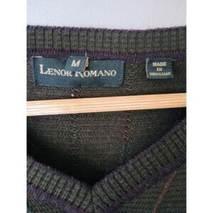 mid-century modern dark olive green V-neck sweater vest with purple and multi-colored vertical pinstripes.