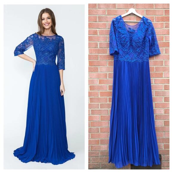 Lenovia 8145 Royal Blue Pleated Embellished Gown Dress Modest Classy Size XL