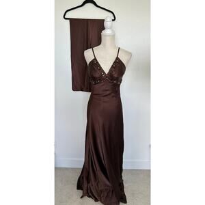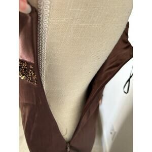 This dress is gorgeous and perfect for a Fall black tie event. It comes in a rich chocolate color that is accepted by bronze beading at the neckline. It is a spaghetti strap style that is adjustable. It is a V neckline the bust line is lightly padded. It is a floor-length dress. There is a hidden side zipper and it comes with a matching wrap. Additional beads and sequins are included. This dress is gorgeous. Fully lined. New with tags.