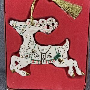 Lenox porcelain Christmas ornament depicting a leaping reindeer dated 2007, finished in ivory with hand-painted red and green details and gold-tone accents.