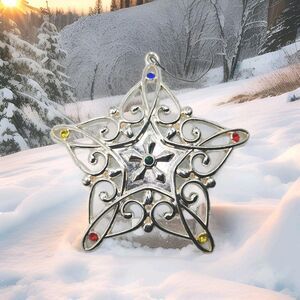 The Lenox 2010 Snow Majesty Annual Christmas Tree Snowflake Ornament is a beautiful and contemporary piece perfect for the holiday season. Made of metal with rhinestone accents, this medium-sized ornament features a snowflake shape and a silver color. With a charming hanging design, this single ornament is a timeless addition to any Christmas tree.
