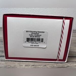 This Lenox “2019” Annual Snowman Ornament is in the original box. It features a cheerful snowman with a shovel, crafted from ivory china and accented with 24K gold and holly patterns, making it a festive addition to holiday decorations.