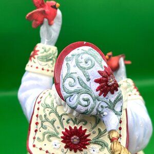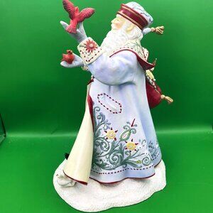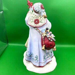 This exquisite Lenox "A Christmas Traveler" figurine is a beautiful addition to any holiday collection. Designed by the talented Lynn Bywaters, this piece features a majestic Santa Claus dressed in a richly detailed, light blue coat with elegant floral and snowflake patterns. Santa is depicted as a friend to nature, holding a bright red cardinal in his hand, with other small cardinals and doves gathered at his feet. A festive red sack filled with gifts, including a nutcracker, is slung over his shoulder, adding to the charm of this holiday display. The figurine stands approximately 9 inches tall and is crafted from fine porcelain with meticulous hand-painted details. It is in excellent, pre-owned condition and is a perfect piece for collectors of Lenox Christmas items or Santa Claus figurines. It is a truly unique and charming piece that will bring holiday cheer to your home for years to come. Please review all photos as they are part of the item's description.