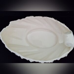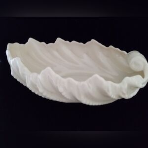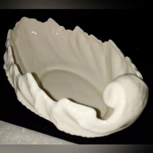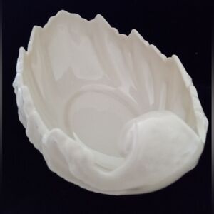 This Lenox ACANTHUS Cream Oval Leaf Candy Dish is a vintage piece made in the USA from fine porcelain. This design was produced from the 1930's to the 1950's. The "Made in the USA" teal Logo on the bottom distinguishes this one from Lenox made in recent years in China. This also makes it more collectible for collectors .The dish features a solid cream color with a glossy finish, measuring 6 inches in length, 3 inches in width, and 2 inches in depth. Its French Country style and leaf-shaped design make it a charming addition to any home decor, perfect for displaying candies or small trinkets. The delicate detailing and quality craftsmanship reflect the elegance and sophistication synonymous with the Lenox brand.