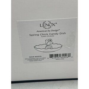 This charming Lenox candy dish features a delightful spring chick design with vibrant yellow and gold floral accents. It is brand new in an open, damaged box. Ideal for decorative use or as a unique gift.