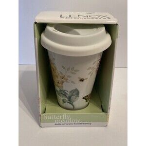 Brand new in box Lenox Butterfly Meadow thermal travel mug. This 10oz double-wall ceramic coffee cup features the iconic floral, butterfly & bee design with a snug white travel lid. Perfect for coffee, tea, or gifting. Elegant cottagecore style meets everyday function.
