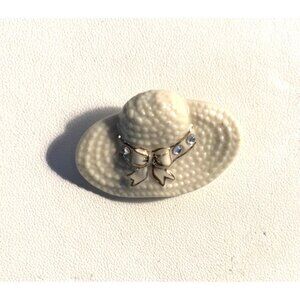 Lenox Ceramic Hat Brooch With Rhinestone Bow Accent White Textured Finish Pinbac