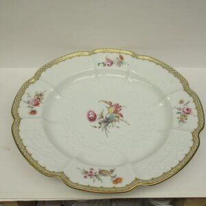 This really pretty Mayence 12 1/2 Inch large round serving platter was made by Lenox China in the 1980s. This platter is a reproduction of a porcelain platter circa 1760. It is signed on the back Lenox China MADE IN U.S.A. The platter is in very good condition with no chips, cracks or scratches. The floral decoration and gold trim is all very good. Be sure to see our other Lenox china available.