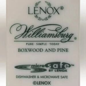 This elegant pattern was produced by Lenox from 2002 through 2007 and is now discontinued. It features fruit, pine cones and branches on white with gold trim.