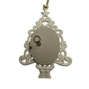 The Lenox Christmas Tree Photo Frame Porcelain Ornament is a beautifully crafted decorative piece perfect to display a favorite photo during the holiday season. Made of ivory colored porcelain with gold trim, this classic scroll detailed ornament features a hanging design and is part of the American By Design collection by Lenox.