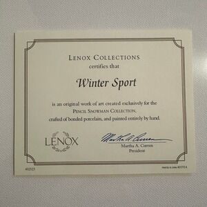 Lenox Collection certifies that "Winter Sport" is an original work of art created for the Pencil Snowman Collection, crafted of bonded porcelain, and painted entirely by hand.