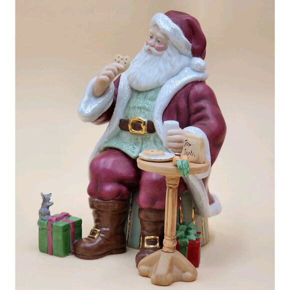 Charming vintage Santa Claus figurine featuring Santa enjoying a cookie and glass of milk beside a small table labeled “For Santa.” Beautifully detailed with classic holiday colors, textured clothing, and warm hand-painted accents. A delightful Christmas décor piece perfect for collectors, mantel displays, or seasonal vignettes.