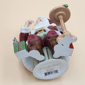 Santa is seated with gifts at his feet, wearing traditional red attire with a soft vintage aesthetic. This figurine displays excellent craftsmanship and festive character.