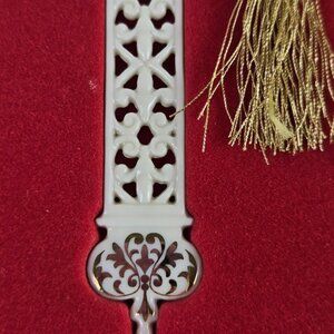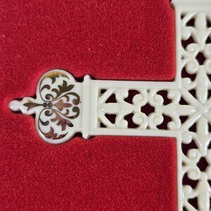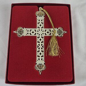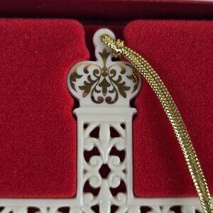 Beautiful pierced cross in signature Lenox coloring of cream with gold accents. Gold tasseled hanger. Comes in the original box.