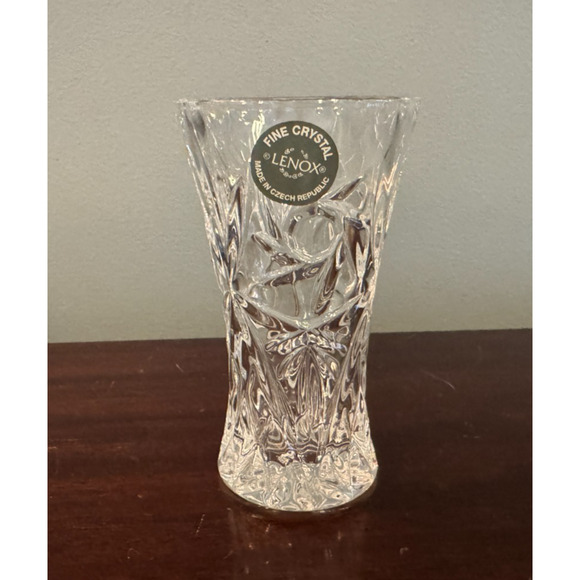 Beautiful Lenox Crystal Star Vase, measuring about 4 inches tall. Crafted of fine European full-lead crystal in the Czech Republic, this vase features a flared shape and intricate starburst cut pattern that catches the light beautifully.