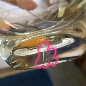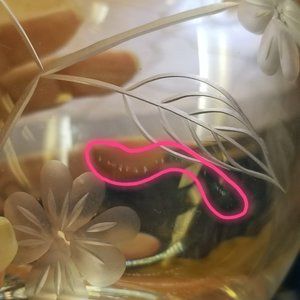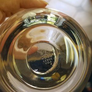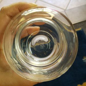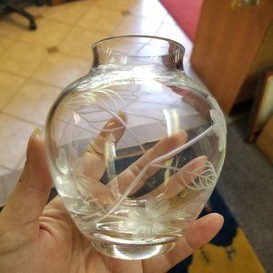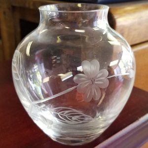 This is a small, previously owned lead crystal vase from Lenox. It has 3 etched flowers on a single stem with some leaves. There are some small blemishes as shown. There are no chips, cracks, or broken areas. It measures approximately 5" tall.