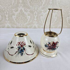 This is a set of two tea light holders from the Lenox Winter Greetings line. The base of each holder has a cardinal amidst holly leaves and red ribbon. A gold toned tea light holder is attached to the base and surrounded by the support for the removable shade. The shade has the same holly leaf pattern with red ribbon. Pierced holly leaf shapes accent the shade. Gold trim at the top and bottom of each piece. Comes in the original box.