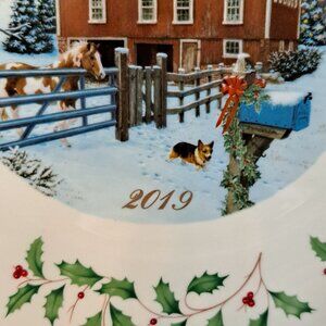 The 2019 Lenox Holiday Collectors Plate features a snowy barn theme. The rim of the plate is decorated with holly and a bow at the top. The plate is crafted of Lenox ivory fine china, embellished with jewel-like hand enameling and trimmed with 24 karat gold
