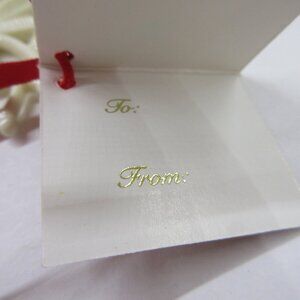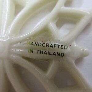 Porcelain filagree snowflake with red ribbon and gift tag, no original packaging. Measures 2" x 2"and has red ribbon attached. Made in Thailand.
